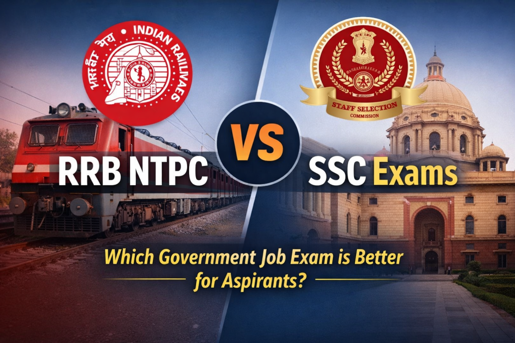 Government job exams are a popular choice among students who want a stable career and a good salary. Two well-known exams are the Railway Recruitment Board Non-Technical Popular Categories (RRB NTPC) and exams conducted by the Staff Selection Commission (SSC). RRB NTPC is conducted to recruit candidates for non-technical posts in Indian Railways, such as Station Master, Goods Train Manager, and Junior Clerk. On the other hand, SSC conducts several national-level exams like the SSC Combined Graduate Level Examination and SSC Combined Higher Secondary Level Examination to recruit candidates for various posts in central government departments and ministries. Through these exams, candidates can build careers in railways, government offices, taxation, and administrative roles. Because both exams offer stable jobs, good salaries, and career growth, many aspirants often compare RRB NTPC and SSC exams to decide which one is better for them.